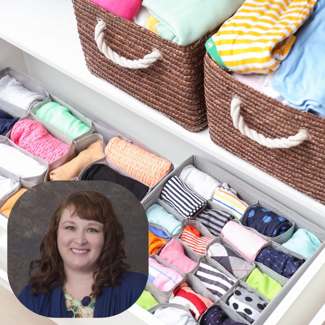 Bins of multi colored socks with an inset photo of a brown haired light skinned woman