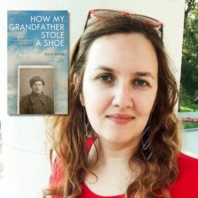 Light skinned brunette in a red shirt with a neutral expression on her face next to an inset cover of the book "How My Grandfather Stole a Shoe"