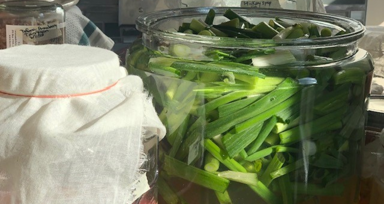 A jar with a red substance in it and a jar with cut up green vegetable matter in it sitting next to each other