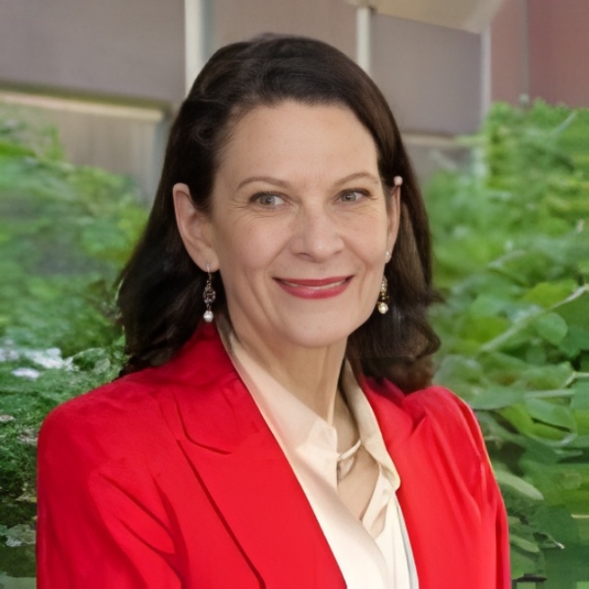 Smiling light skinned woman with brown hair wearing a red blazer