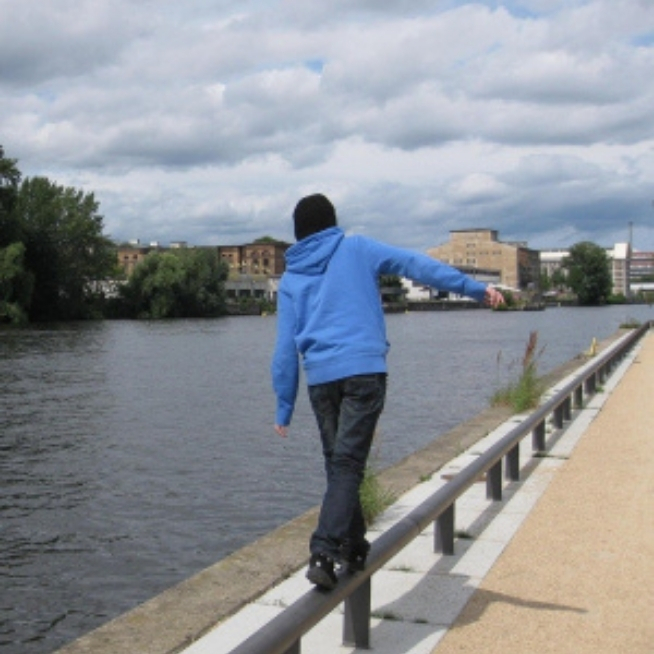 Teen in a blue hoodie and black cap balancing on a railing next to a body of water