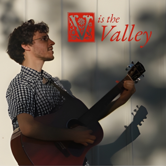 Light skinned man playing guitar with V in the Valley words next to him